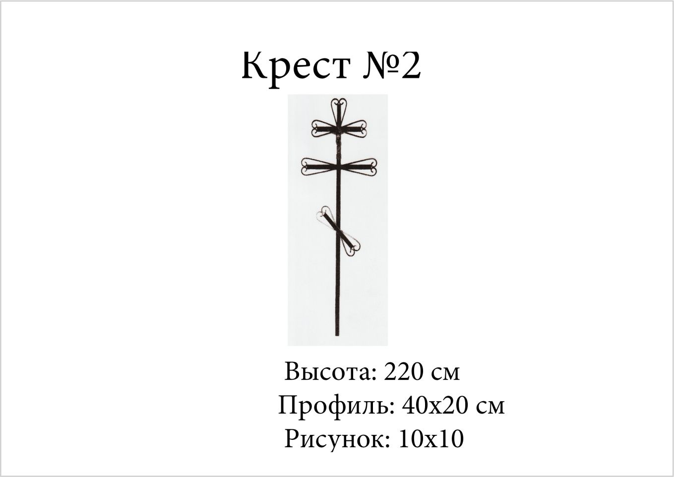 Крест №2 — идеальный выбор для тех, кто ищет гармонию между качеством и эстетикой. Его высота 220 см создает внушительное присутствие, обеспечивая заметность на кладбище. Профиль 40x20 см гарантирует, что крест устойчив к воздействию внешней среды, а рисунок 10x10 придает ему неповторимый стиль.