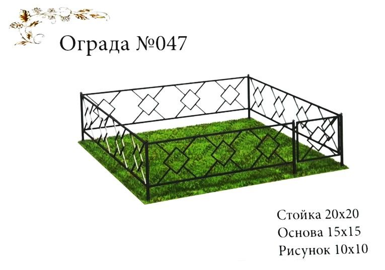 Ограда №047 - это стильный и качественный элемент благоустройства могил на кладбище. Изготовлена из прочного металла, стойка имеет размер 20x20 см, основа - 15x15 см, а рисунок на ограде занимает площадь 10x10 см. Вместе с оградами мы также предлагаем оптом и в розницу металлические кресты, скамейки, столики и другие элементы для создания уютного и достойного места памяти.