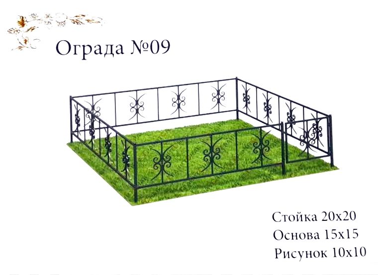 "Ограда № 9" - это красивое и надежное изделие для благоустройства могил. Оградки изготовлены из высококачественного металла с характеристиками: стойка 20x20, основа 15x15, рисунок 10x10.